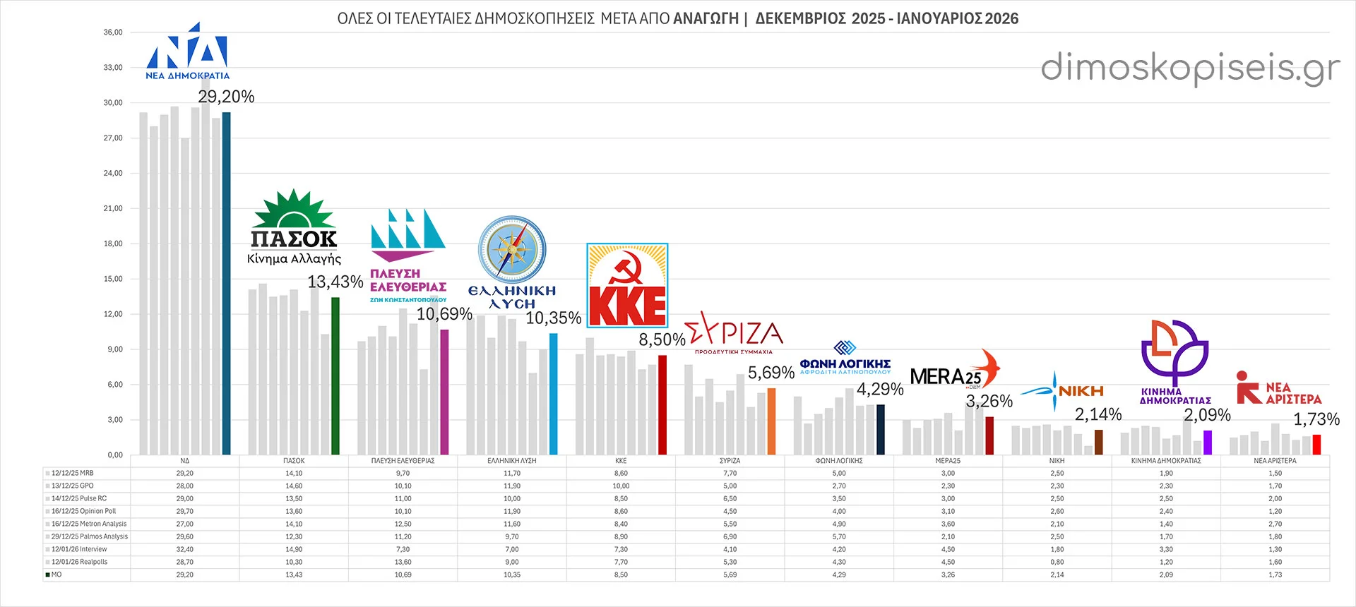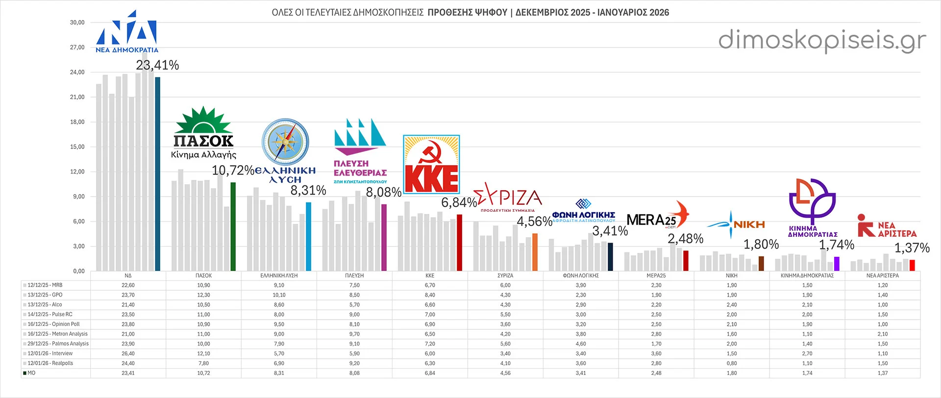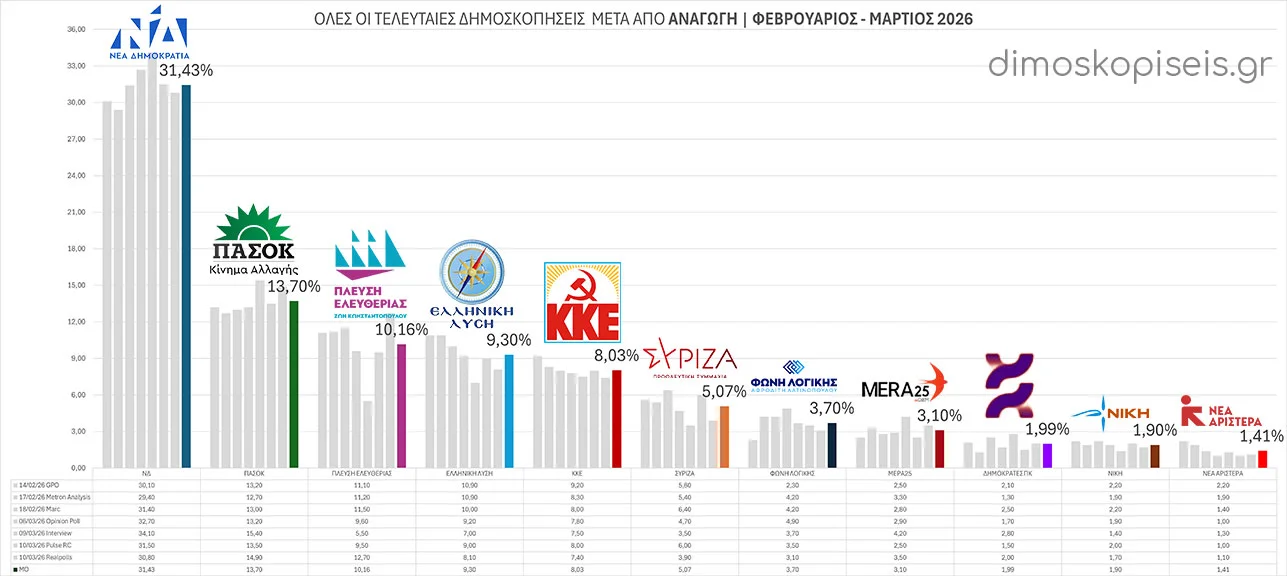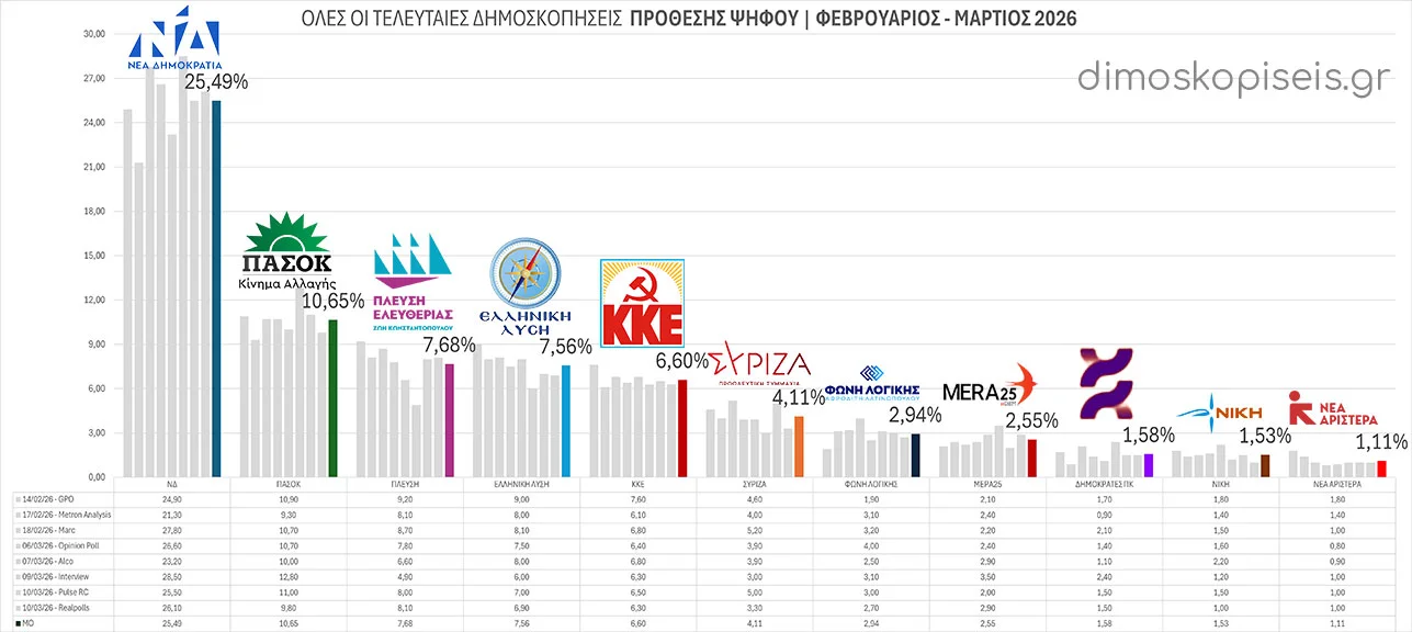 - 10/03/26 Με την ταυτόχρονη δημοσίευση τριών νέων δημοσκοπήσεων της ALCO για το ALPHA tv, της Opinion Poll για Action 24 και της Interview για το political.gr ξεκινάμε τον Μάρτιο 2026. Και οι τρείς συμφωνούν σε σημαντική αύξηση των ποσοστών της Νέας Δημοκρατίας και πτώση στα ποσοστά της Πλεύσης Ελευθερίας και της Ελληνικής Λύσης. Μικρή άνοδο παρατηρούμε σε ΠΑΣΟΚ, ΣΥΡΙΖΑ και ΜέΡΑ25.