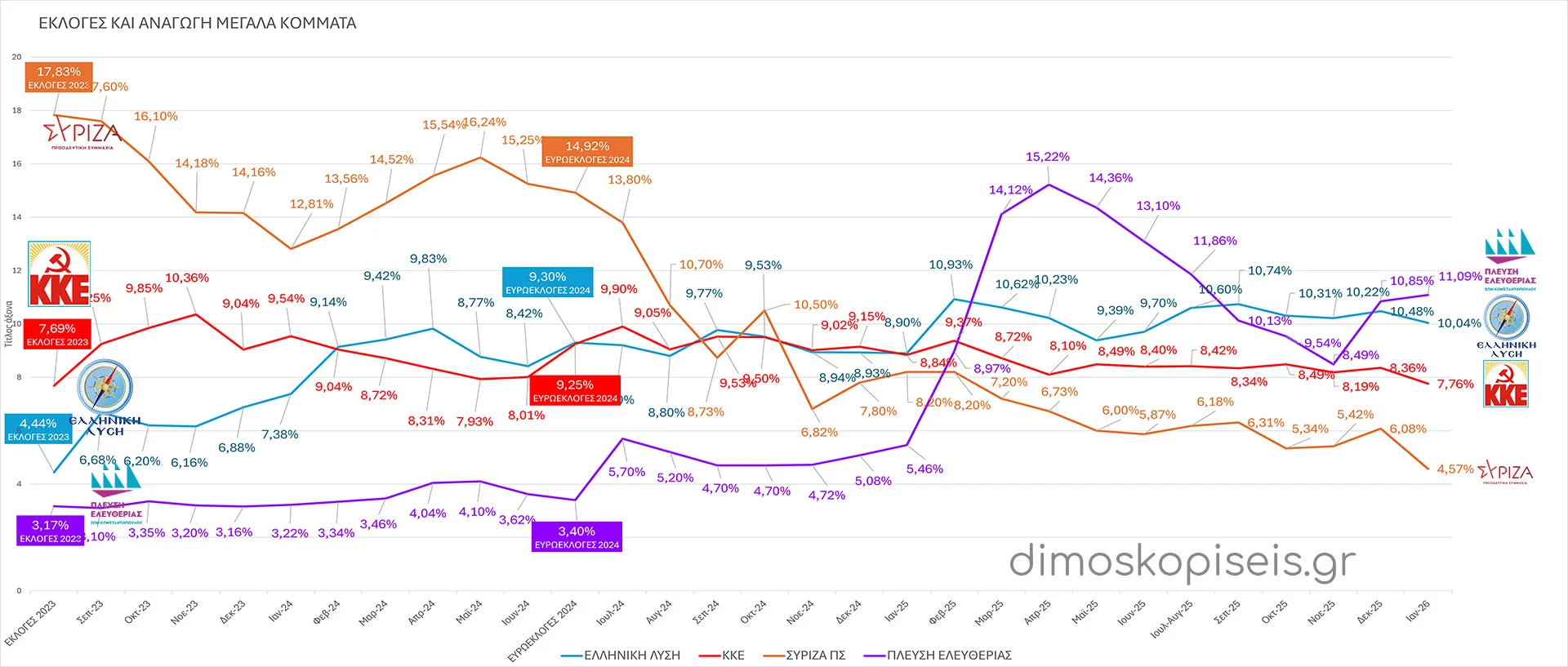 - 19/12/25 Σχεδόν ταυτόχρονα παρουσιάστηκαν οι τρείς τελευταίες δημοσκοπήσεις του Δεκεμβρίου 2025, της Plulse Rc για τον ΣΚΑΪ της Opinion poll για το action24 και της Metron analysis για το MEGA Channel. Και οι τρείς συμφωνούν σε πτώση για την Νέα Δημοκρατία, άνοδο για την Πλεύση ελευθερίας Στις δύο απο τις τρείς παρατηρούμε άνοδο για την Ελληνική λύση και το ΚΚΕ. Στα υπόλοιπα κόμματα τα ποσοστά διαφοροποιούνται ανάλογα την έρευνα.