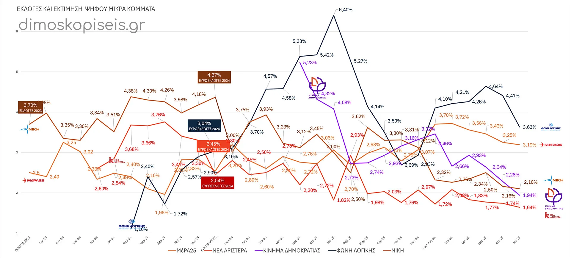 - 01/12/25 Με την τελευταία δημοσκόπηση της MARC για το πρώτο θέμα ολοκληρώνονται οι δημοσκοπήσεις του Νοεμβρίου. Παρατηρούμε άνοδο σε ΠΑΣΟΚ, Νέα Δημοκρατία και ΝΙΚΗ, Πτώση για την Φωνή λογικής και την Πλεύση ελευθερίας .