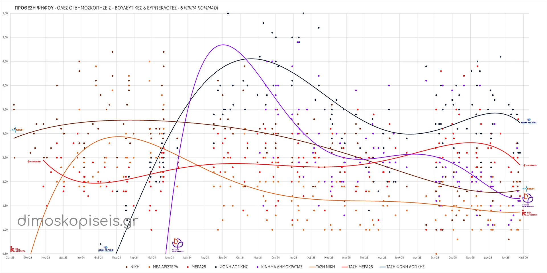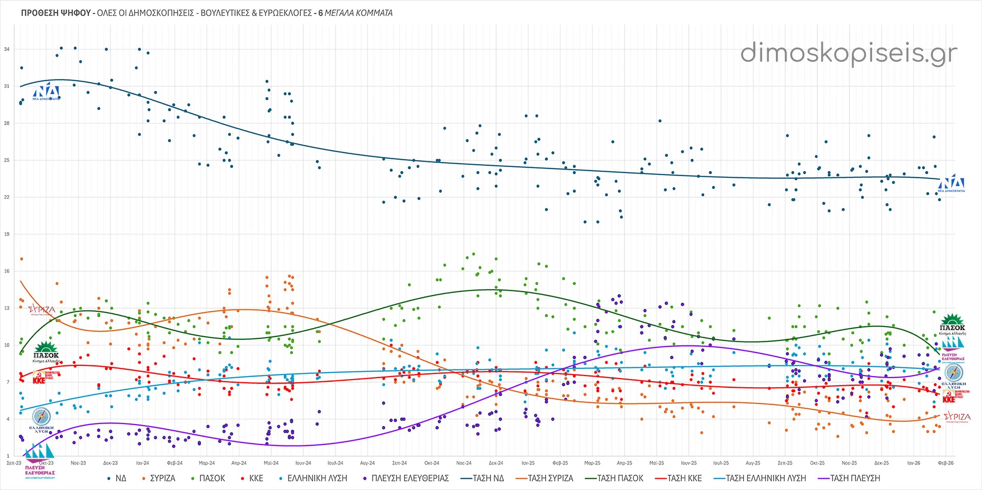 - 23/01/26 Η νέα δημοσκόπηση της Metron Analysis για το Mega channel παρουσιάζει μεγάλη άνοδο στο άλλο κόμμα και σημαντική άνοδο στην Νέα Δημοκρατία. Πτώση σχεδόν σε όλα τα υπόλοιπα κόμματα με μεγαλύτερη μεταβολή για το ΠΑΣΟΚ, το ΣΥΡΙΖΑ, και την Φωνή Λογικής.