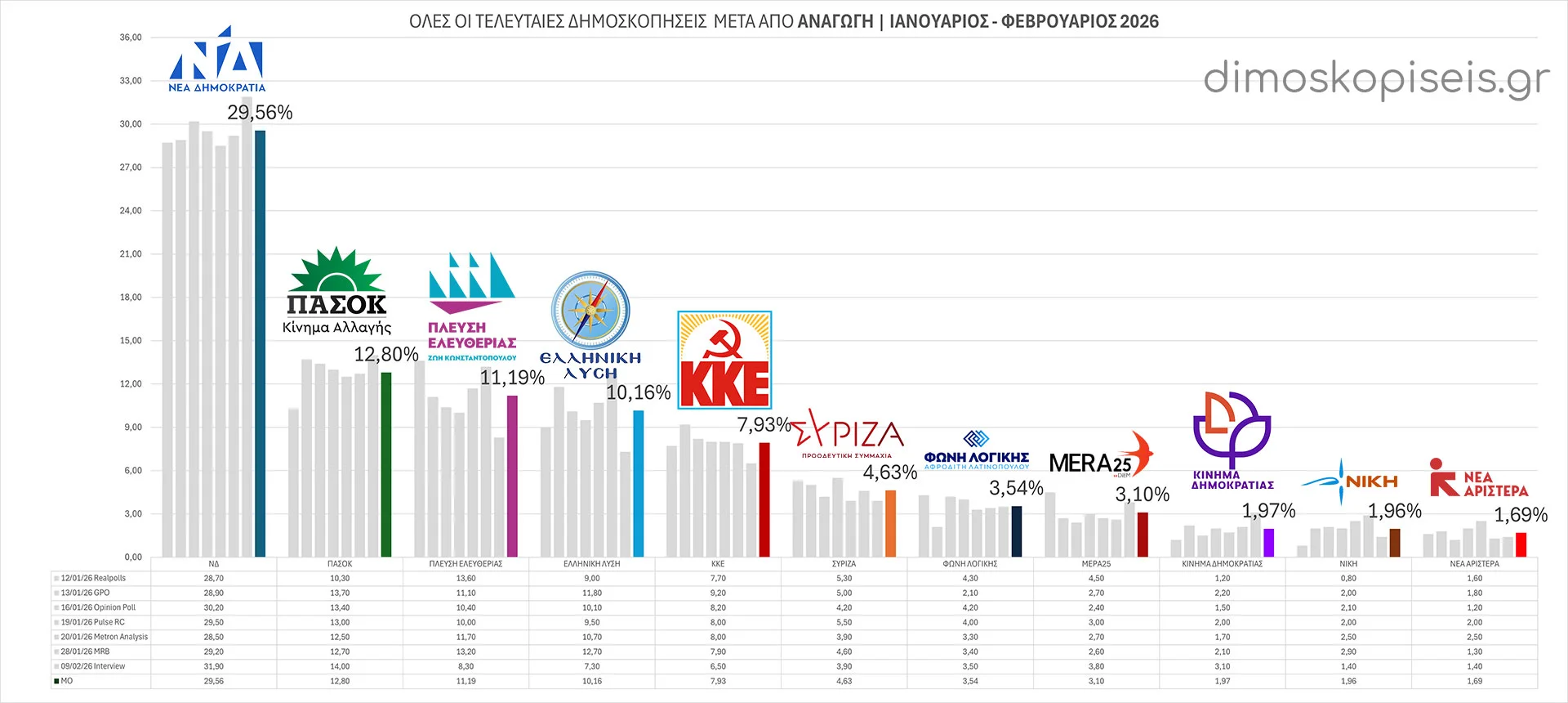 - 27/01/26 Η δεύτερη δημοσκόπηση της Interview για το politic.gr παρουσιάζει άνοδο στο άλλο κόμμα και στη ΝIKH. Πτώση σχεδόν σε όλα τα υπόλοιπα κόμματα με μεγαλύτερη μεταβολή για το KKE.