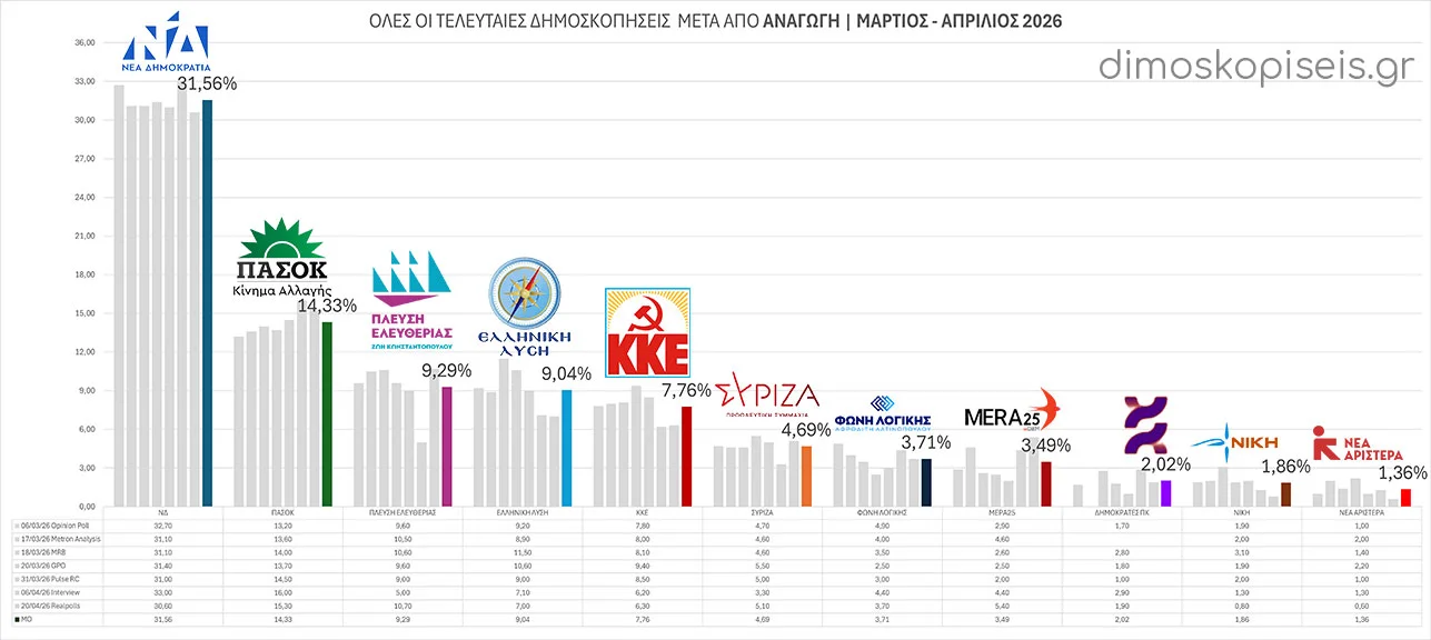 - 07/04/26 Η τελευταία δημοσκόπηση πριν το Πάσχα είναι της Interview για το political.gr Παρατηρούμε πτώση για Νέα Δημοκρατία -1,4 ποσοστιαίες μονάδες (π.μ.) Πλεύση Ελευθερίας -1 π.μ. ΣΥΡΙΖΑ κατά -0,9 π.μ. Σε άνοδο η Ελληνική λύση κατά +0,8 π.μ. Λόγω του Πάσχα αναμένουμε ένα διάστημα τουλάχιστον 15 ημερών χωρίς νέες δημοσκοπήσεις.