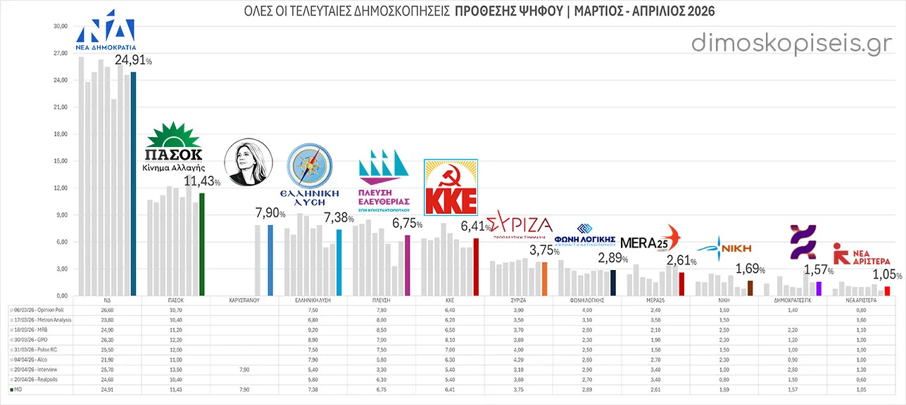 - 06/04/26 Η πρώτη δημοσκόπηση με δεδομένα Απριλίου και μετά την δημοσίευση των στοιχείων για τον ΟΠΕΚΕΠΕ είναι της ALCO για το Alpha tv Παρατηρούμε (στην πρόθεση ψήφου) πτώση για την Νέα Δημοκρατία κατά -1,3 π.μ. (ποσοστιαίες μονάδες) στην Πλεύση Ελευθερίας κατά -0,8 π.μ. και το ΚΚΕ κατά -0,5 π.μ. Σε άνοδο το ΠΑΣΟΚ κατά +1 π.μ.