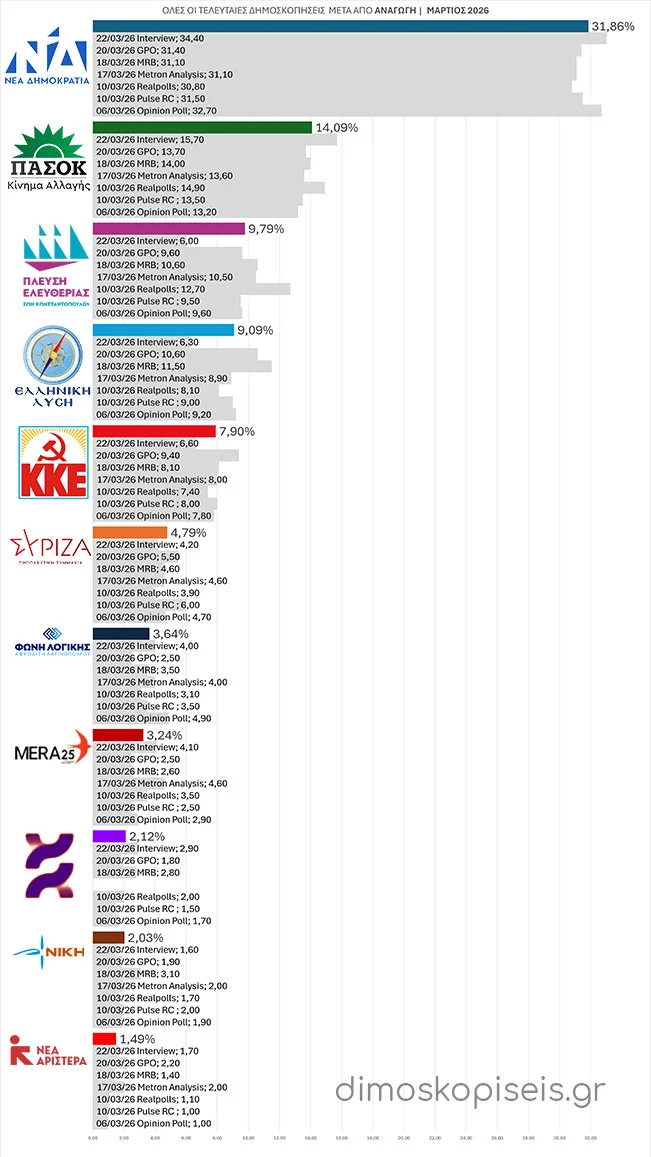 - 10/03/26 Με την ταυτόχρονη δημοσίευση τριών νέων δημοσκοπήσεων της ALCO για το ALPHA tv, της Opinion Poll για Action 24 και της Interview για το political.gr ξεκινάμε τον Μάρτιο 2026. Και οι τρείς συμφωνούν σε σημαντική αύξηση των ποσοστών της Νέας Δημοκρατίας και πτώση στα ποσοστά της Πλεύσης Ελευθερίας και της Ελληνικής Λύσης. Μικρή άνοδο παρατηρούμε σε ΠΑΣΟΚ, ΣΥΡΙΖΑ και ΜέΡΑ25.