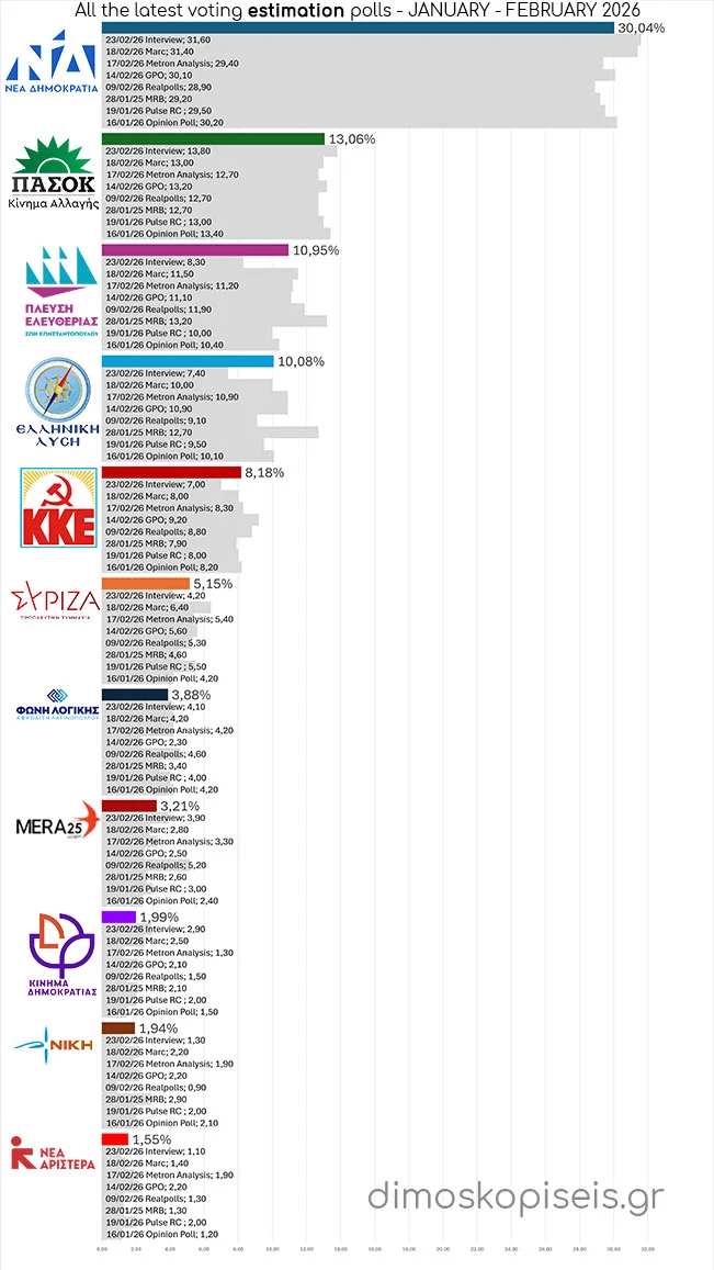 The first month of 2026 is characterized by a drop in the percentages of all parties except New Democracy and Freedom Movement, which showed a slight increase. This is due to the shift of some voters to the undecided vote in anticipation of the new parties, especially that of Ms. Karystianou, which is expected before Easter.