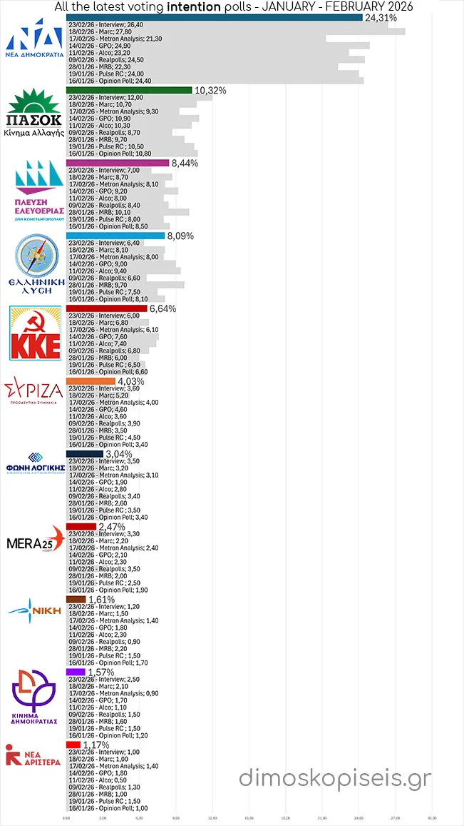 January 2026 can be characterized as relatively poor in terms of opinion polls with 8 companies presenting 10 opinion polls with voting intention and 7 companies proceeding with the processing – reduction of 8 opinion polls. Interview, as usual, proceeded with 2 opinion polls and GPO with two surveys but with only one reduction.