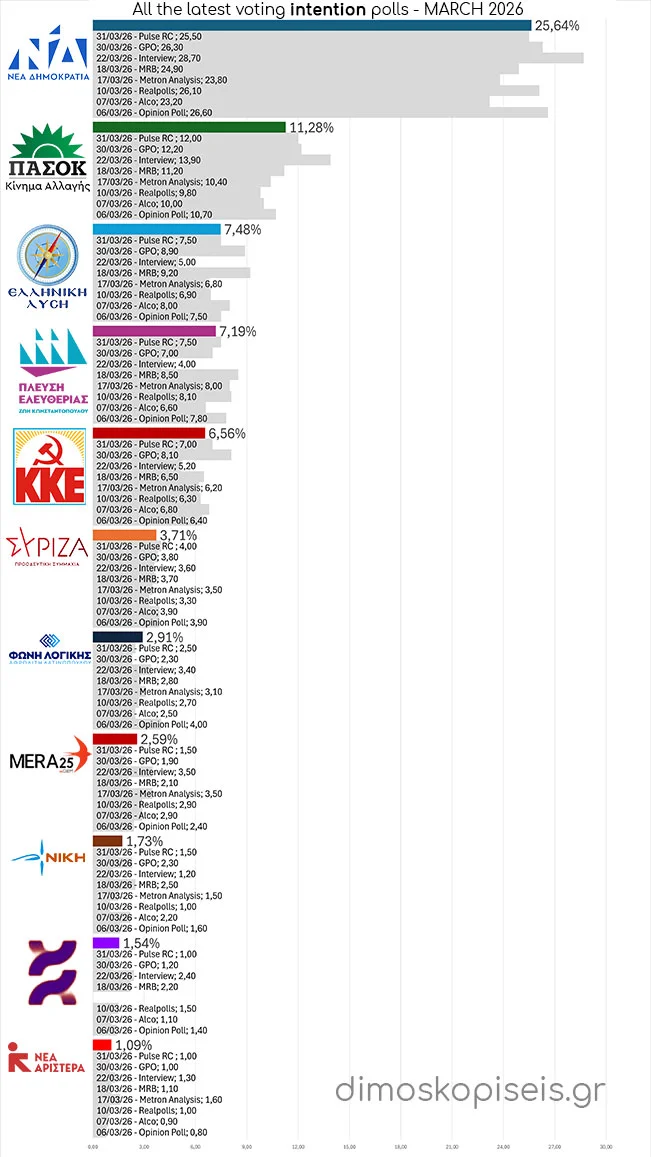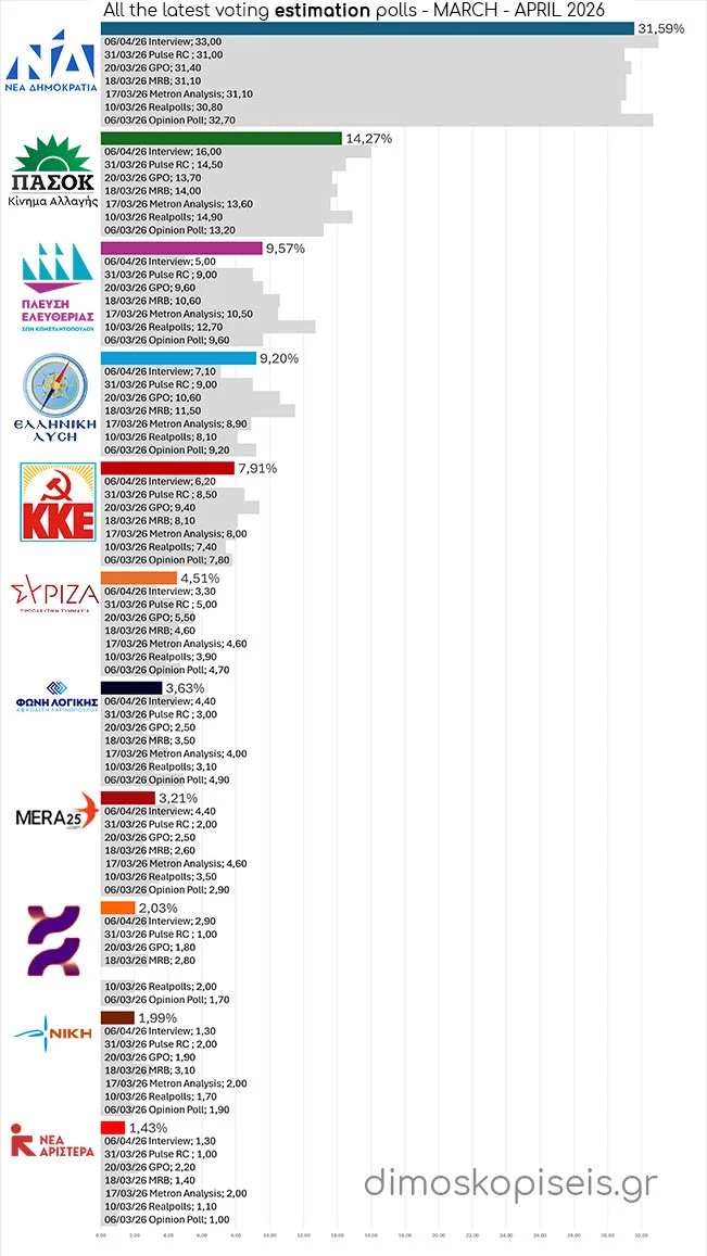 The upward trends of New Democracy continue in February 2026. This rise brings the average of the polls after the reduction of New Democracy to 30.28%, which is the highest performance of New Democracy since the 2024 European elections by +1.97 percendance units (pu) and lower percentages since the 2023 elections by -10.28 percendance units (pu).