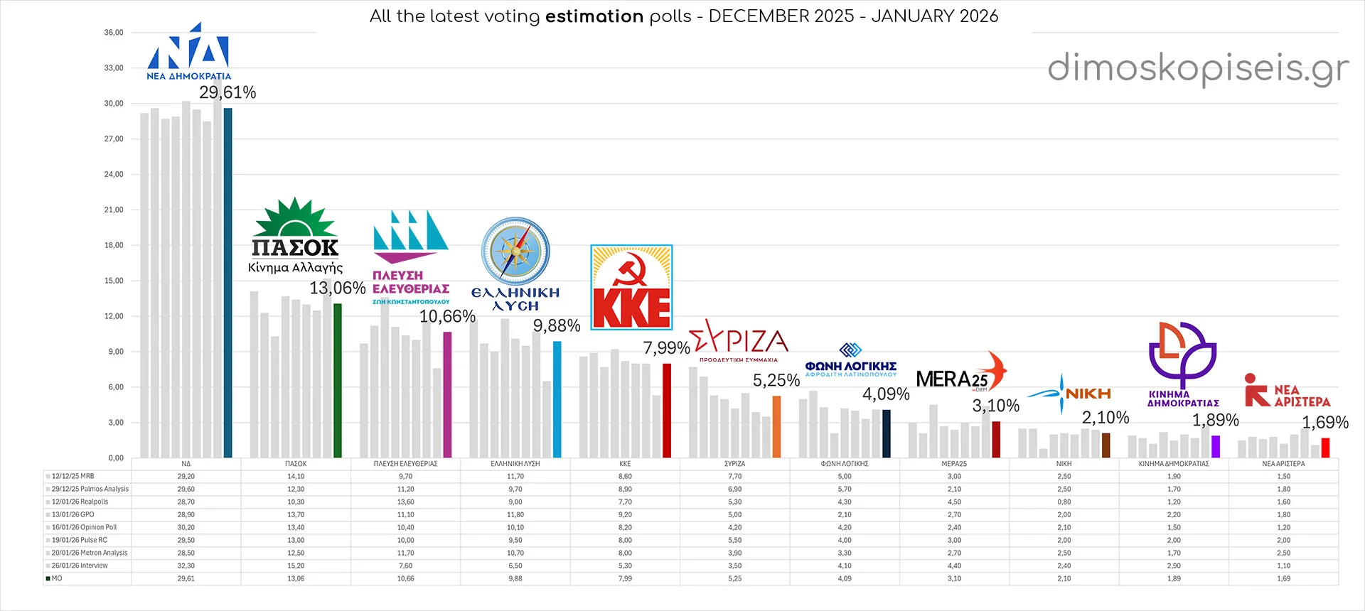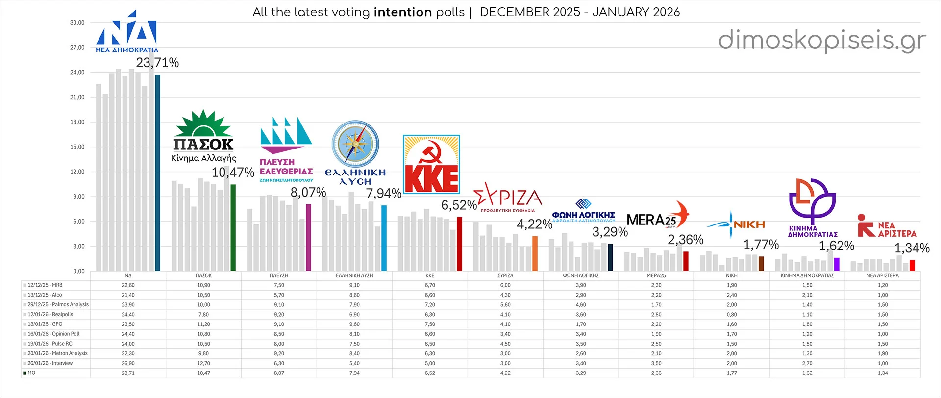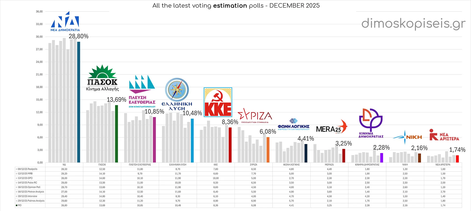 New Democracy has declining growth in December 2025. These fluctuations bring the average of the polls after reducing New Democracy to 28.80%, which is the largest percentage for 2025 and is higher than the 2024 European elections by +0.49% and lower than the 2023 elections by -11.76%.