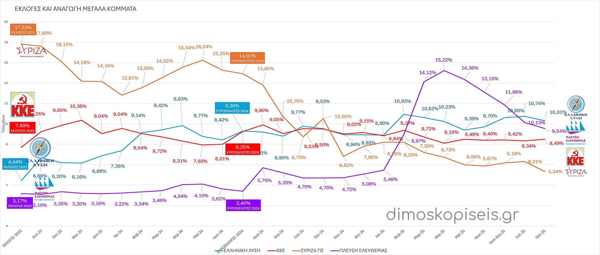 ΕΚΛΟΓΕΣ & ΔΗΜΟΣΚΟΠΗΣΕΙΣ ΠΛΕΥΣΗ ΕΛΕΥΘΕΡΙΑΣ – ΕΛΛΗΝΙΚΗ ΛΥΣΗ – ΚΚΕ -ΣΥΡΙΖΑ ΠΣ μετά από ΑΝΑΓΩΓΗ, Οκτώβριος 2025
