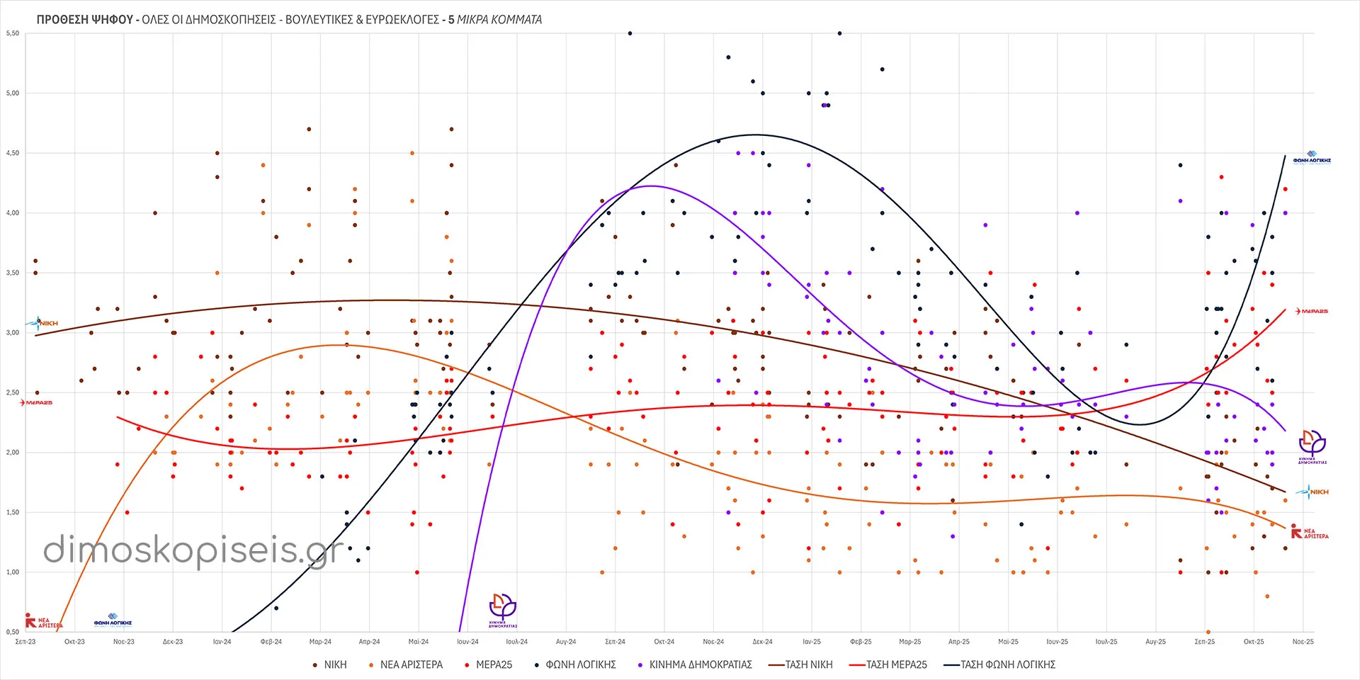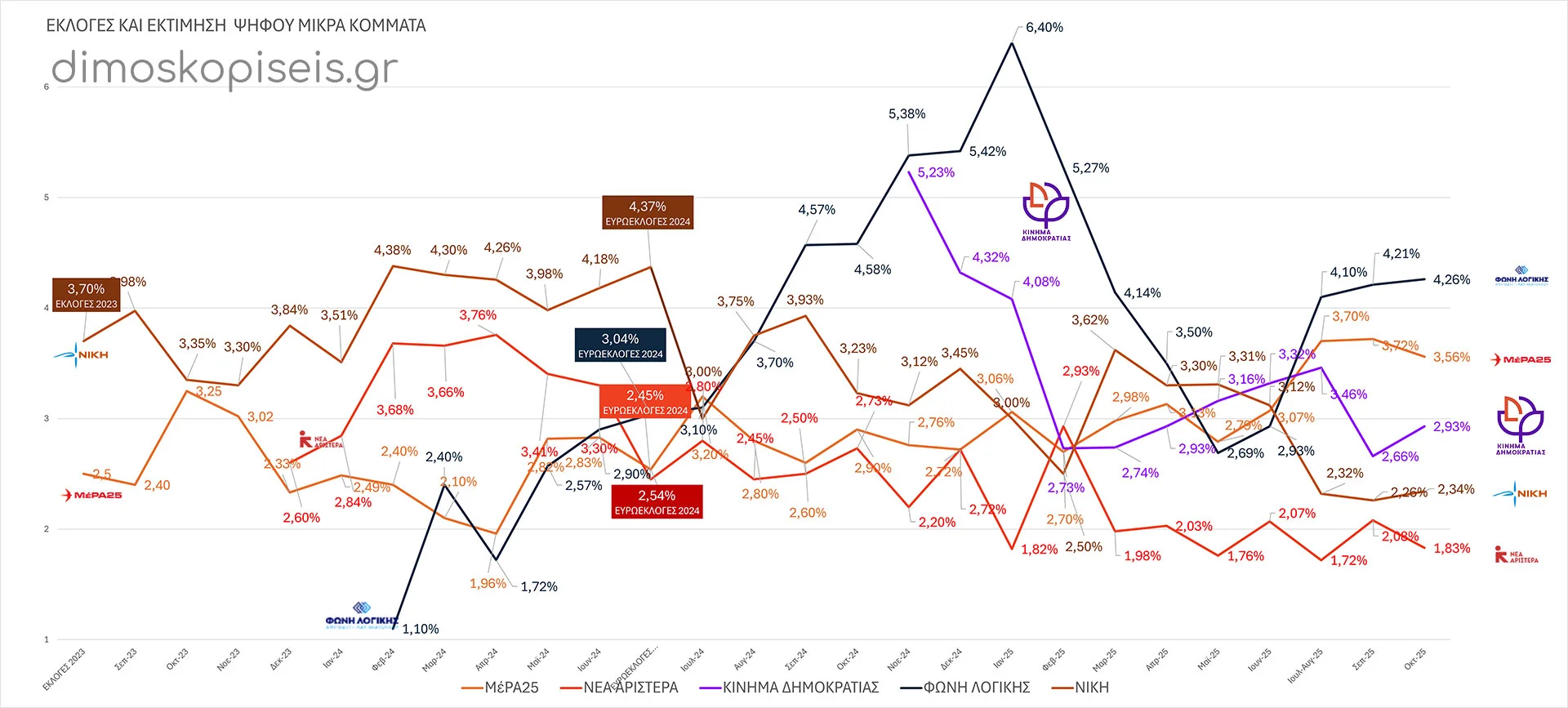 ΔΗΜΟΣΚΟΠΗΣΕΙΣ μετά από αναγωγή – ΒΟΥΛΕΥΤΙΚΕΣ & ΕΥΡΩΕΚΛΟΓΕΣ – Φωνή Λογικής – ΝΙΚΗ – ΜέΡΑ25 – Κίνημα Δημοκρατίας – Νέα Αριστερά – Οκτώβριος 2025