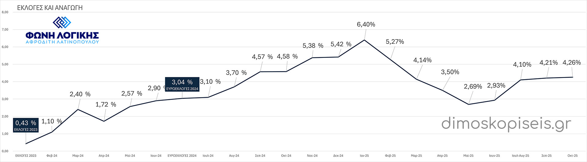 Η άνοδος για την Φωνή Λογικής συνεχίζεται και τον Οκτώβριο του 2025 αν και με μειωμένο ρυθμό σε σχέση με τους δύο προηγούμενους μήνες. Η άνοδος αυτή σταθεροποιεί τη Φωνή Λογικής σε εκλόγιμα ποσοστά στο 4,26% στις δημοσκοπήσεις μετά από αναγωγή, πάνω κατά +1,22% από τις ευρωεκλογές και +3,83% σε σχέση με τις βουλευτικές εκλογές του 2023.