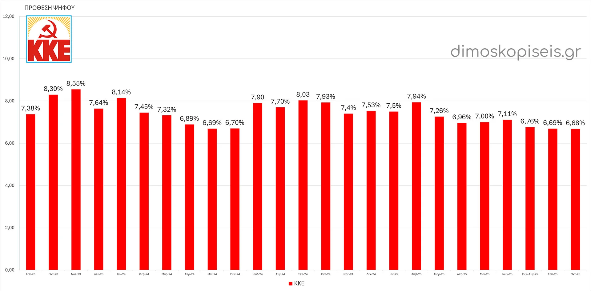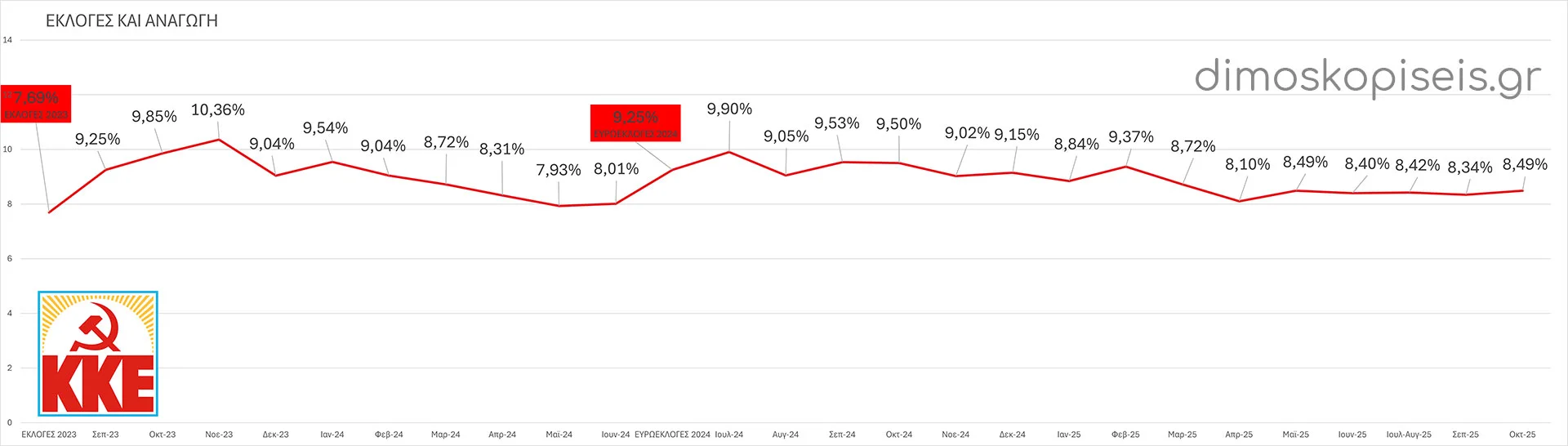 Το πλέον σταθερό κόμμα δεν θα μπορούσε να κινηθεί διαφορετικά τον Οκτώβριο του 2025 που το ΚΚΕ παρουσιάζει σχεδόν τα ίδια ποσοστά εδώ και πέντε μήνες. Παρά τα χαμηλά ποσοστά η σταθερότητα του ΚΚΕ το διατηρεί στην 5η θέση με προοπτική για την 4η θέση αν συνεχιστεί η πτώση της Πλεύσης Ελευθερίας. Το ΚΚΕ έχει Μ.Ο. στις έρευνες μετά από αναγωγή στο 8,49% κάτω κατά -0,76% από το ποσοστό των Ευρωεκλογών 2024 και λίγο πάνω κατά +0,80% από τις βουλευτικές εκλογές του 2023.