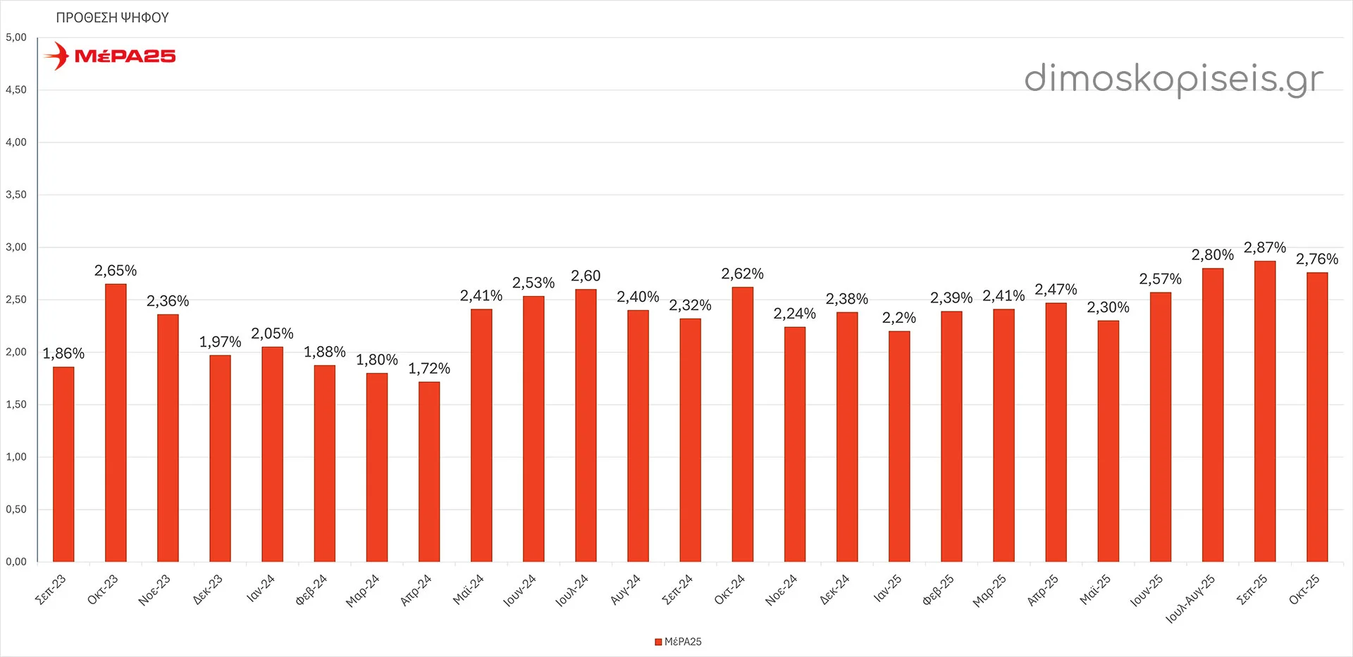 ΜέΡΑ25 ΔΗΜΟΣΚΟΠΗΣΕΙΣ ΠΡΟΘΕΣΗΣ ΨΗΦΟΥ έως Οκτώβριο 2025