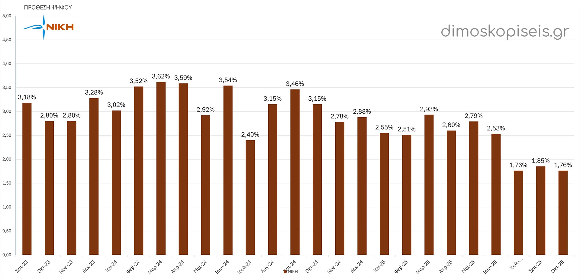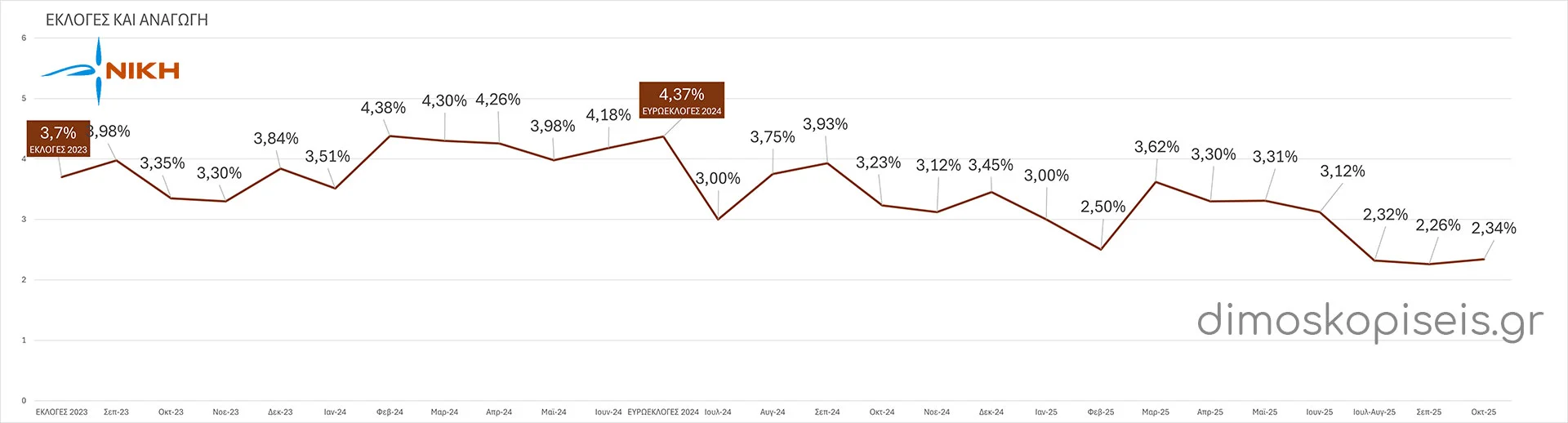 Η ΝΙΚΗ τον Οκτώβριο του 2025, συνεχίζει να έχει τα χαμηλά ποσοστά των τριών τελευταίων μηνών. Εμφανίζεται κάτω από το εκλογικό όριο του 3% στο 2,34% στις δημοσκοπήσεις μετά απο αναγωγή. Έτσι ο Μ.Ο. των δημοσκοπήσεων μετά από επεξεργασία (αναγωγή) τη βρίσκει χαμηλότερα κατά -2,03 από το ποσοστό των Ευρωεκλογών και χαμηλότερα κατά -1,36% από το ποσοστό των εθνικών εκλογών.