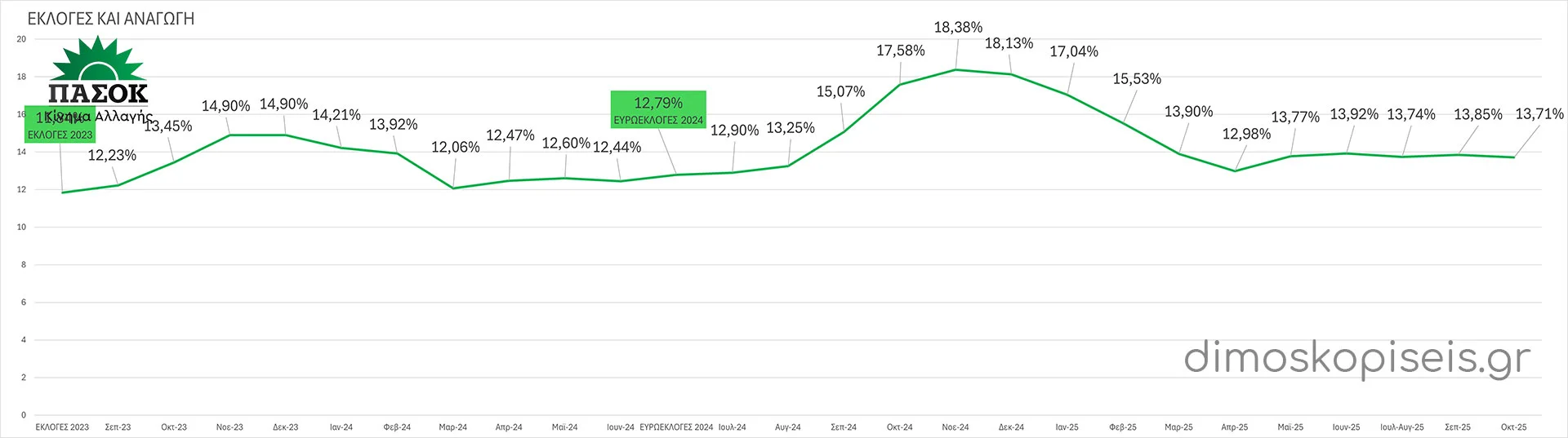Σταθερό με οριακή πτώση το ΠΑΣΟΚ τον Οκτώβριο του 2025. Το ΠΑΣΟΚ συνεχίζει να διατηρεί ξεκάθαρα τη δεύτερη θέση με Μ.Ο. στο ποσοστό 13,71% μετά από αναγωγή που είναι +0,92% πάνω από το ποσοστό των ευρωεκλογών και +1,87% πάνω από τις εθνικές εκλογές 2023.